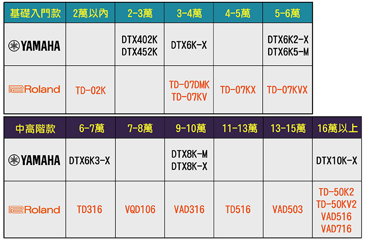 ▲Roland初、中階電子鼓的規格配置與價格列表供參考: