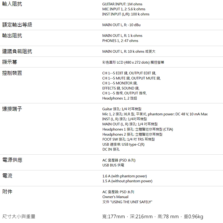 • 麥克風輸入具備幻象電源和低噪聲和寬廣增益範圍(+70 dB) 的高品質前級擴大