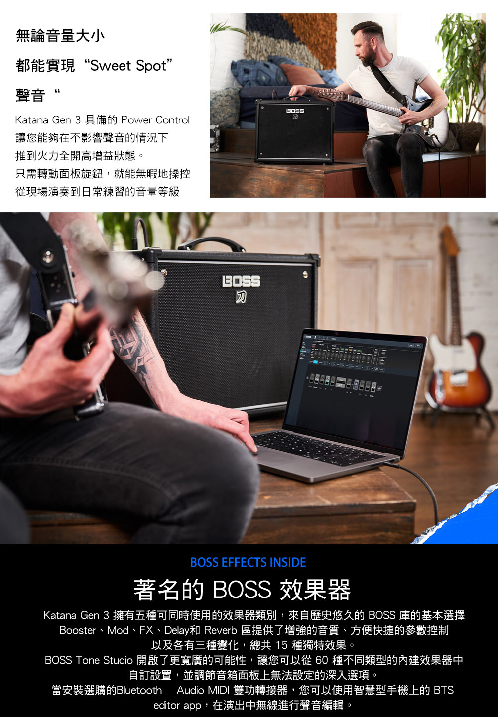 ‧使用超過 60 種高級 BOSS 效果類型來自定內建效果器