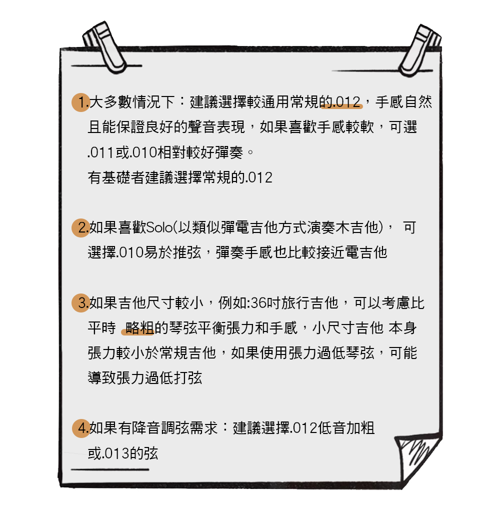 2.如果喜歡Solo(以類似彈電吉他方式演奏木吉他), 可選擇.010易於推弦,彈奏手感