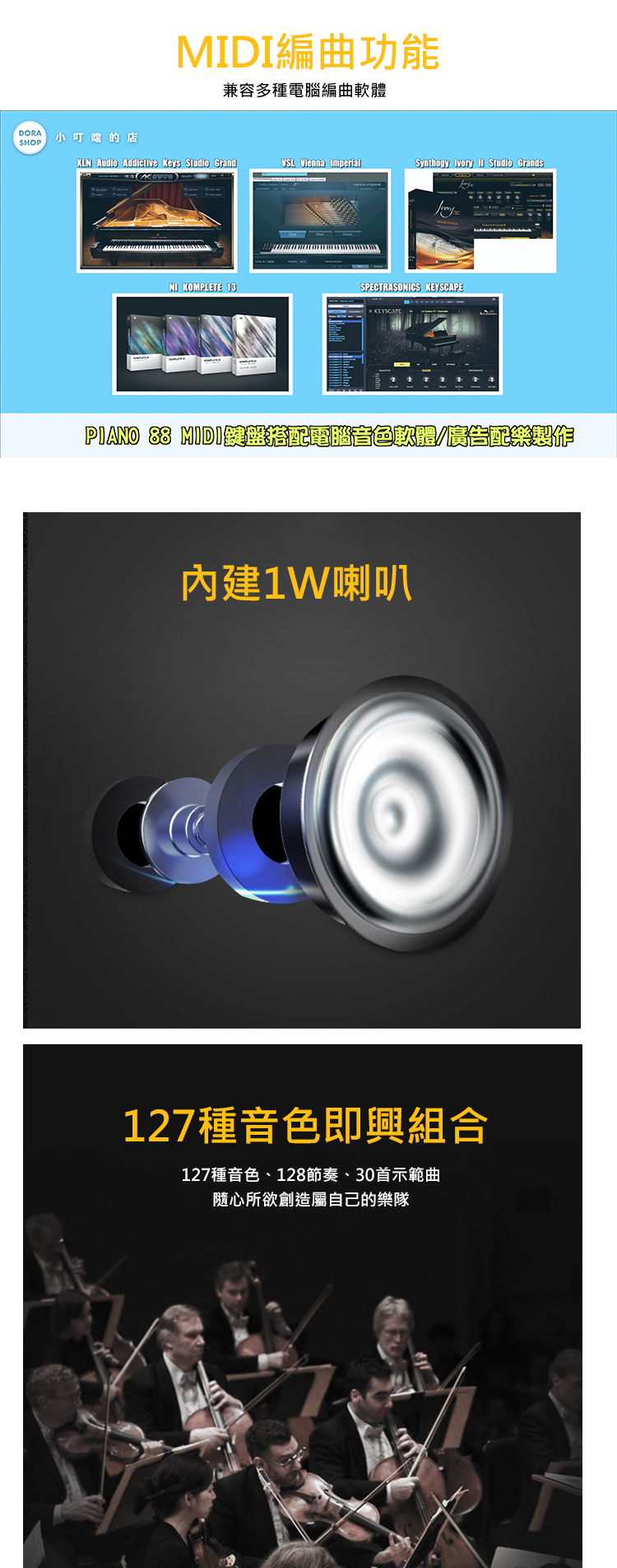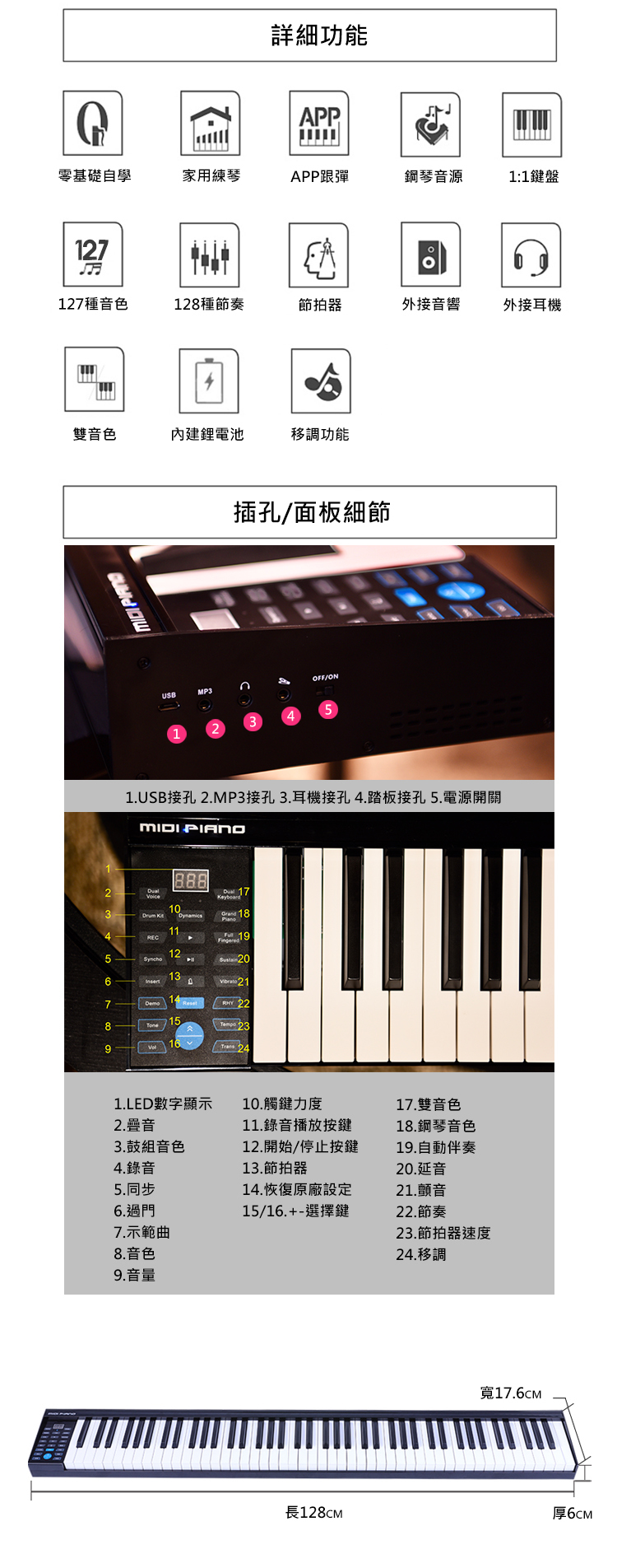 可作為MIDI鍵盤(MIDI CONTROLLER),可用USB線連接電腦或手機或平板的音樂軟體使用,內建127種音色128種節奏,編曲作曲兩相宜,而且輕薄好攜帶、不限制場地。