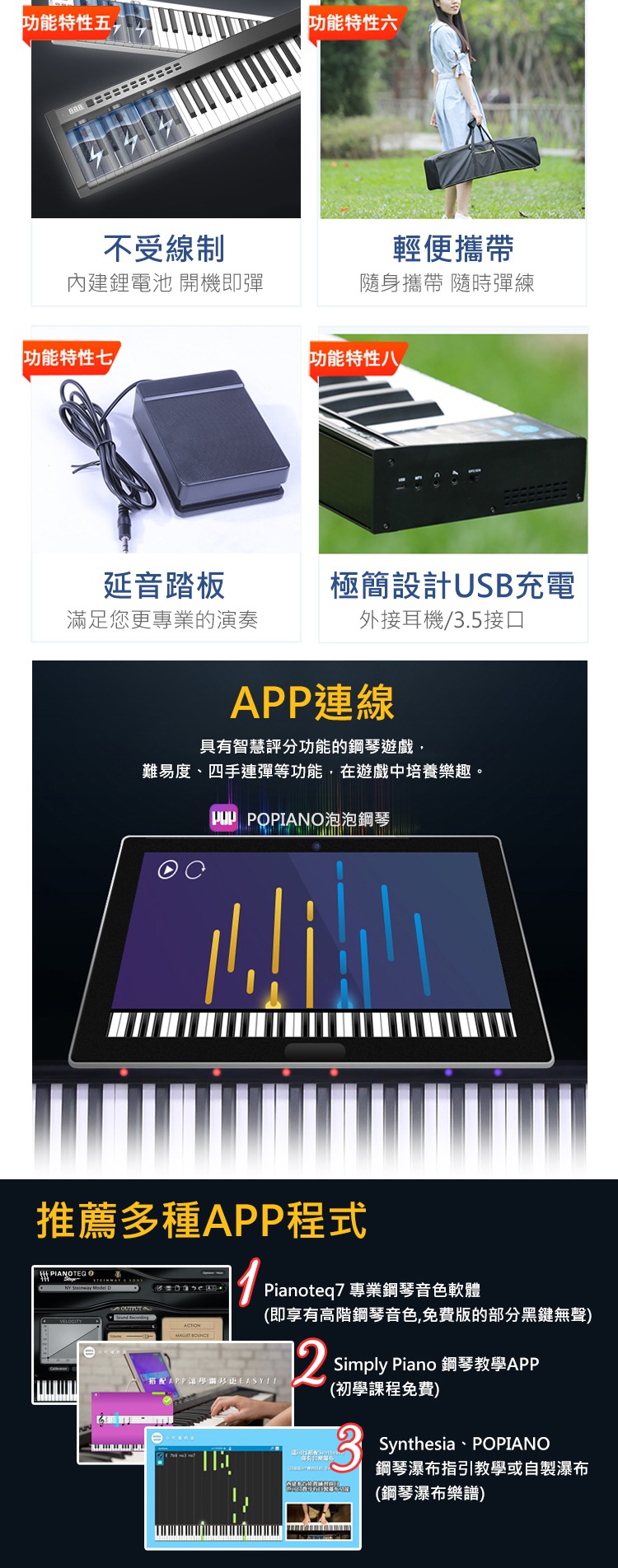 5.可外接耳機、電腦多媒體喇叭、USB充電、附延音踏板