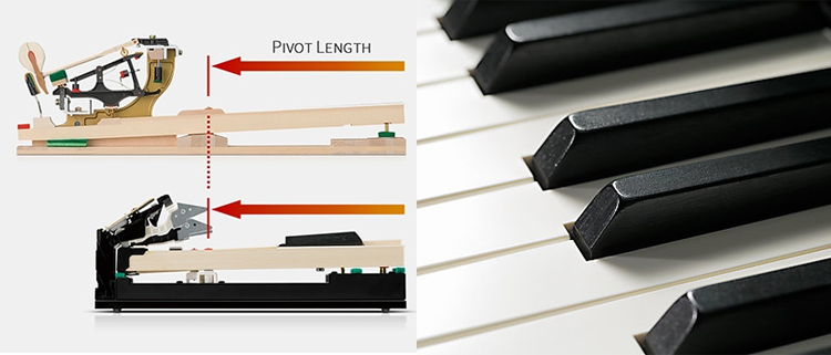 所有88個黑色和白色鍵完全由長木片製成,具有精細紋理的象牙和類似烏木的表面用於吸收水分和輔助控制。每個木鍵都在平衡銷上平穩地轉動——末端上升和下降以複製熟悉的原聲鋼琴動作的“蹺蹺板”動作。