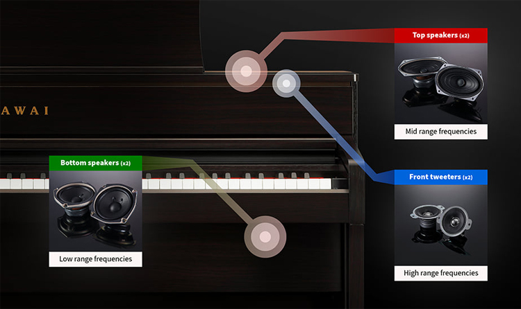 最新的Concert Artist樂器配備高保真揚聲器系統,專為提供深沉的低音和清脆的高音而設計。高規格CA701擁有改進的6揚聲器輸出系統,較低頻率範圍通過儀器底部傳送,中頻和高頻通過頂部安裝的揚聲器和前置高音揚聲器向外投射。其結果是一種寬廣、共振的音調,與原聲三角鋼琴的沉浸式聲場非常相似。