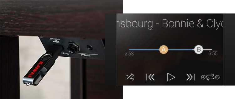 USB存儲設備還可用於播放MP3或WAV音訊檔案,讓彈奏者可以學習新作品的和弦或旋律,或者只是享受與他們喜愛的歌曲一起演奏的樂趣。甚至可以將整個演奏(包括外部線路輸入和藍牙源),錄製為MP3或WAV音頻文件,以便通過電子郵件發送給家人和朋友,或者遠離鋼琴隨意聆聽。
