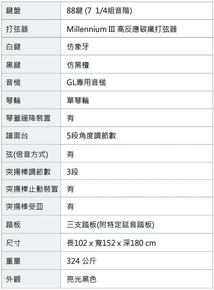 中高音部的琴弦搭載定弦器,獲得更加豐富音質的同時,也使琴弦的位置精密度提升,並使音色、音量更加穩定。譜面台的角度可以做5段調整,在細微的部分也做了奢華的式樣。