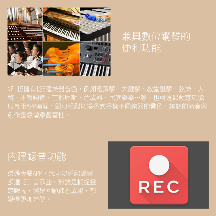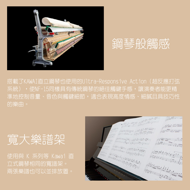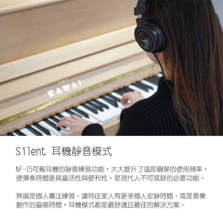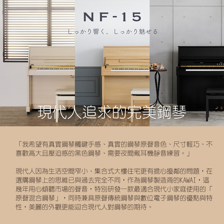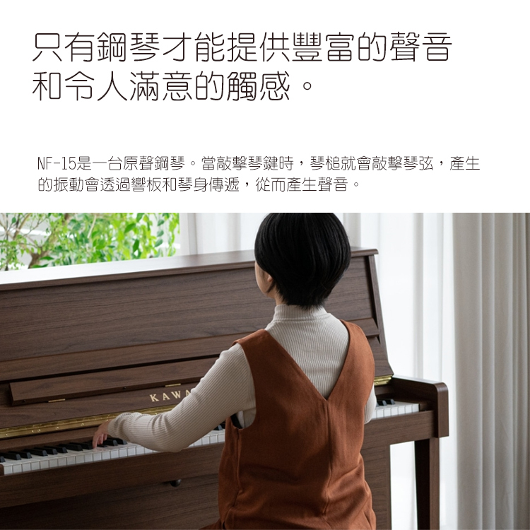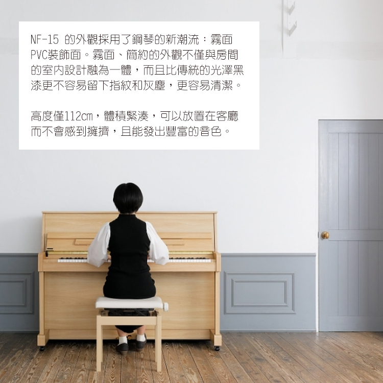 NF-15 的顏色陣容可與您的家中裝飾相融合,讓您可以用自己喜歡的顏色和聲音來彈奏鋼琴