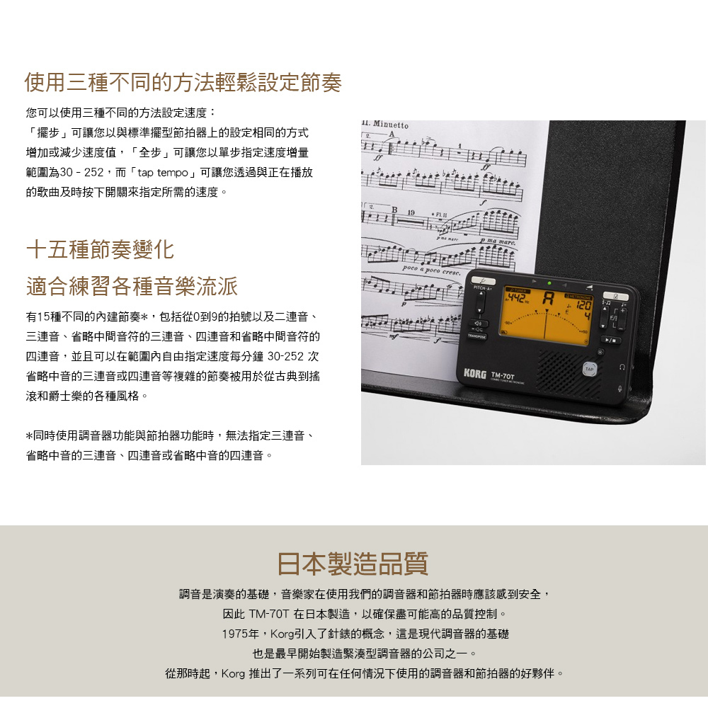 TM-70T 完全是“日本製造”,這證明了 Korg 多年來作為調音器/節拍器世界領導者的自豪感和對品質的承諾。