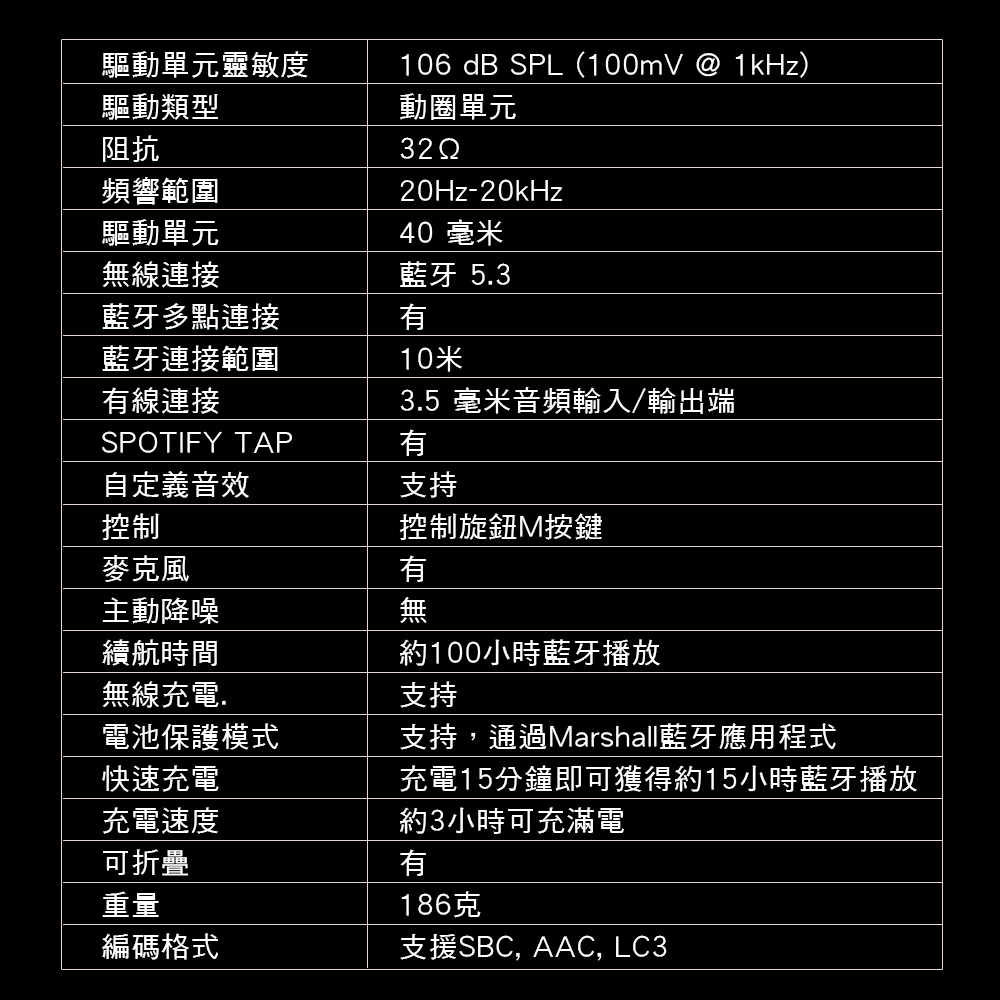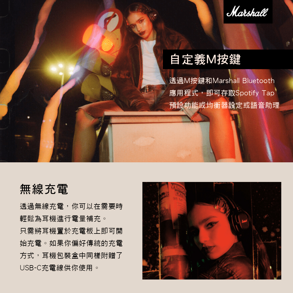 ‧可搭配 Marshall App 自訂 EQ 音色(低音、高音等可微調)。
