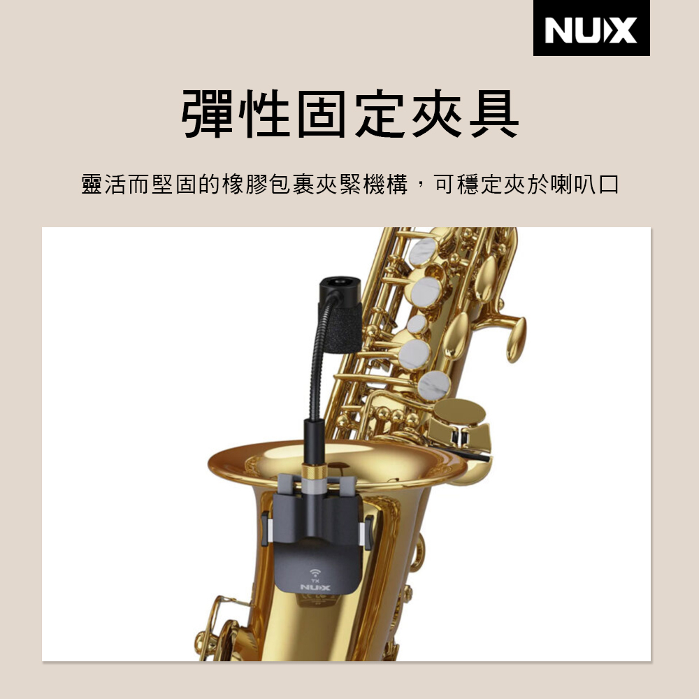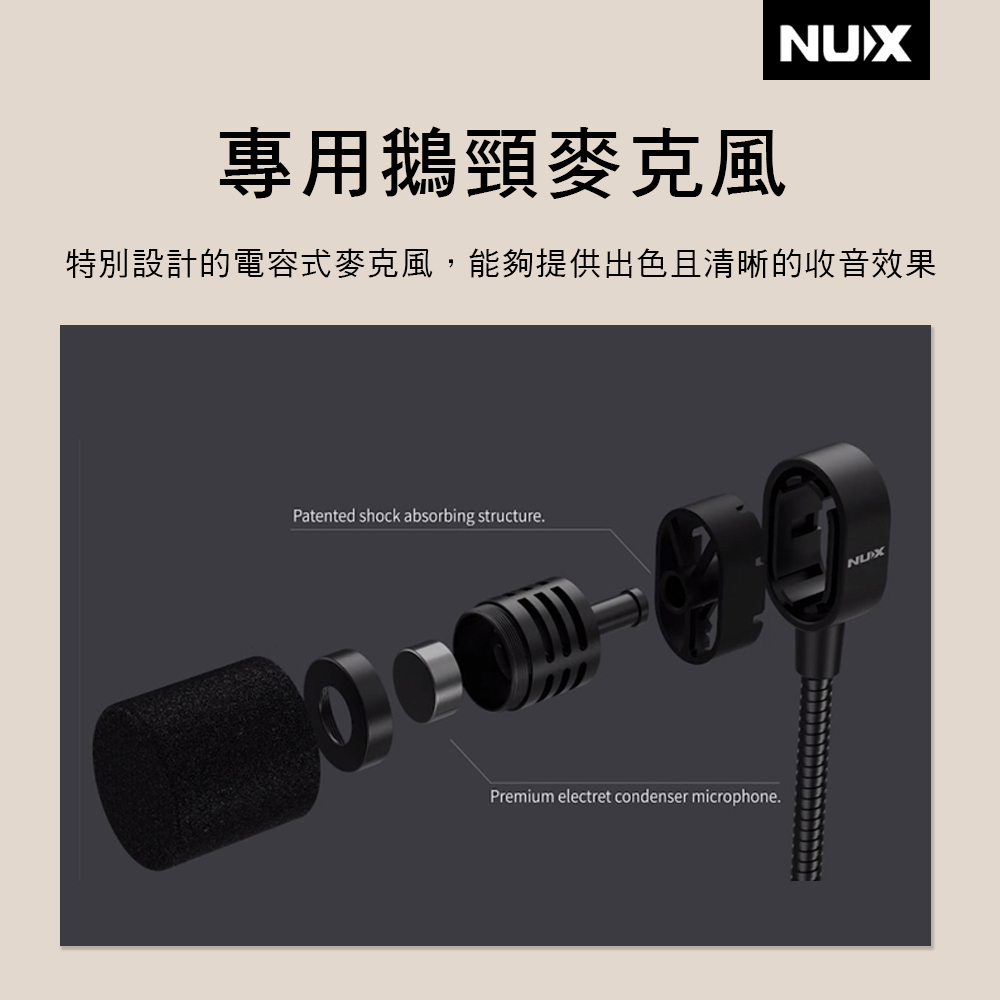 ‧專用鵝頸麥克風+夾具:內建為薩克斯風設計的電容式鵝頸麥克風,並有彈性固定夾具可夾在薩克斯風鐘罩位置。