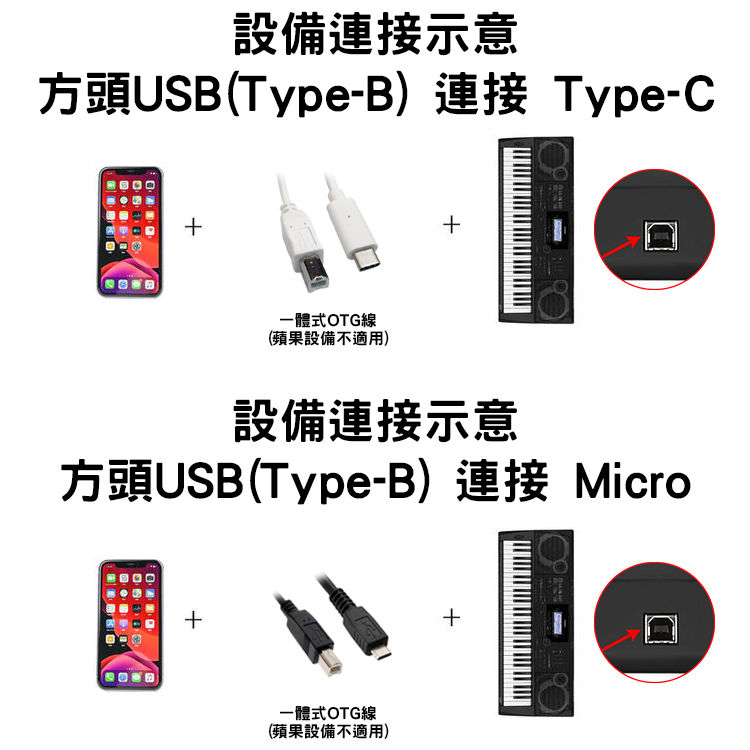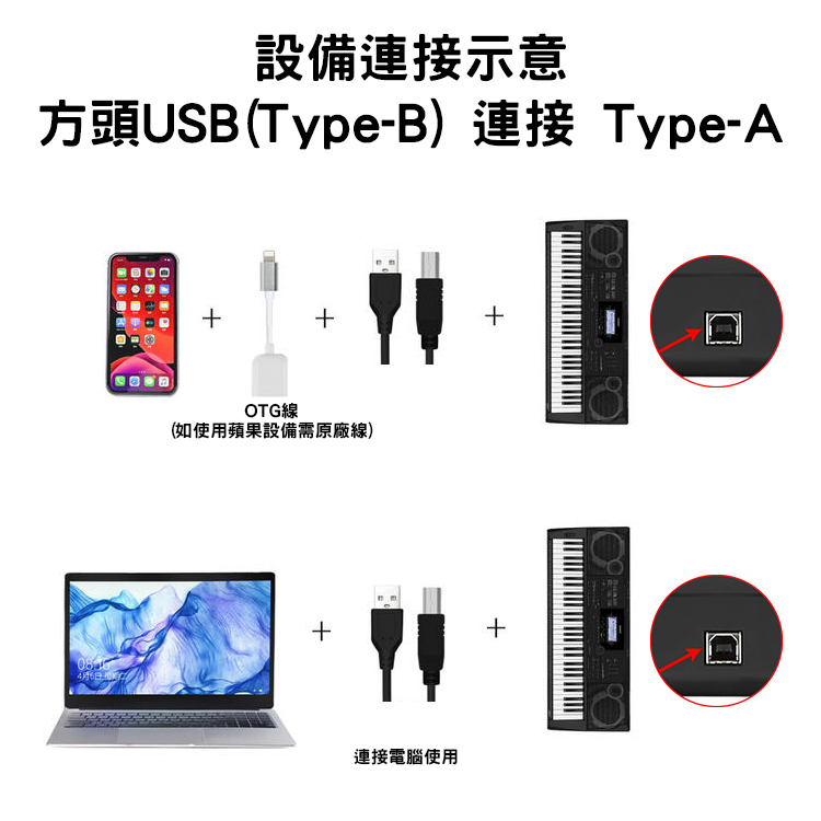 設備連接2:電鋼琴 → 方頭USB 轉  Type-A → OTG線(如使用蘋果設備需原廠線) → 蘋果手機/蘋果平板