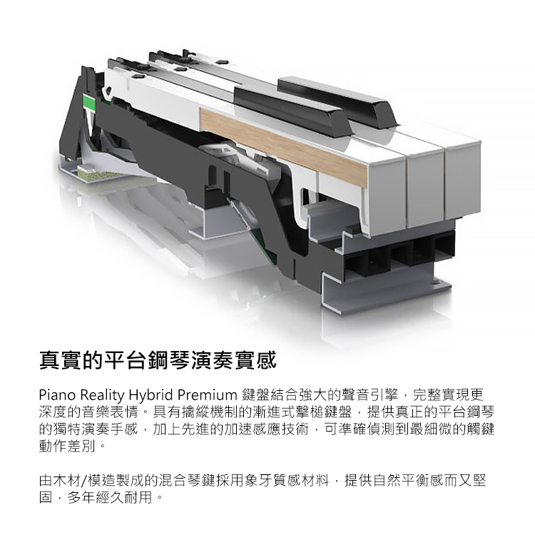 - Piano Reality Premium鍵盤配備漸進式擊槌機制、擒縱機制