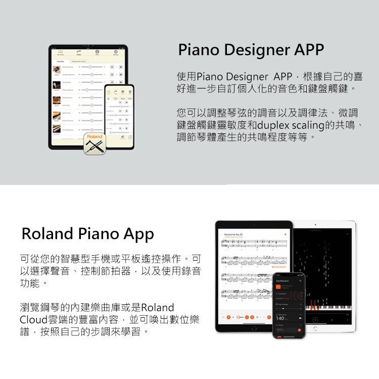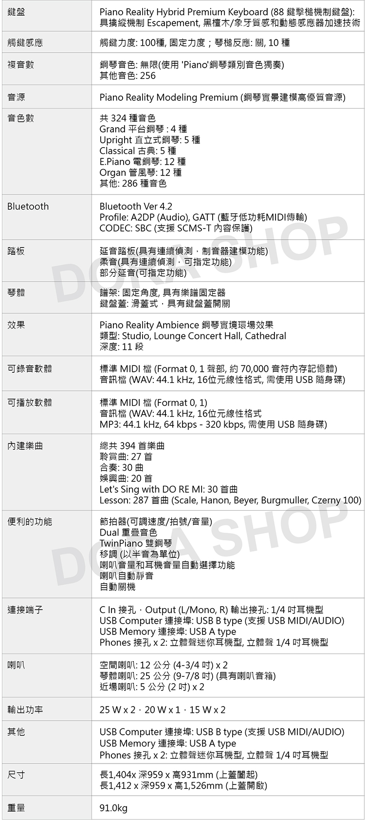 - 鍵盤採用木材/模造複合琴鍵與象牙質感