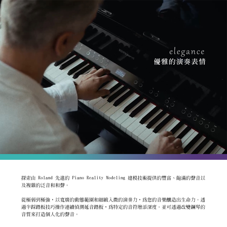 - 採用Roland先進的Piano Reality音源,提供細膩的音樂體驗