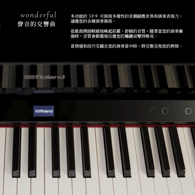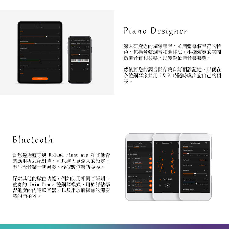 - 可使用Roland Piano App控制 LX-9 的功能,探索課程等等