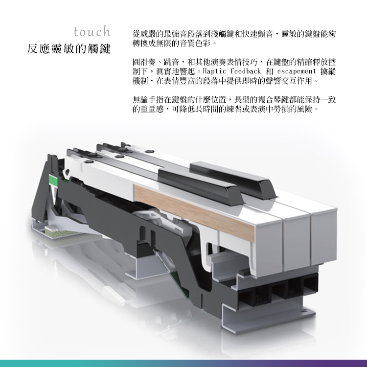 - Hybrid Grand鍵盤採用漸進式擊搥機制、擒縱機制、複合木/象牙質感塑模琴鍵、長度較長的琴鍵樞軸,和獨特的haptic琴鍵振動