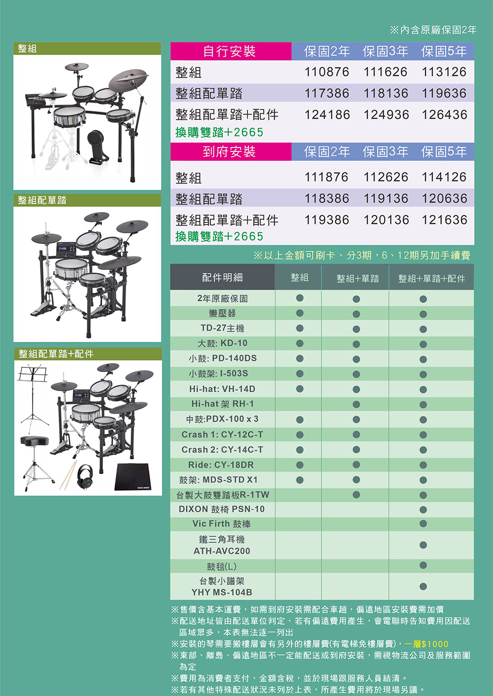 原廠套組加小鼓架、HI-HAT架、大鼓單踏板 $126010