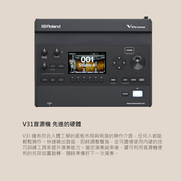 1.V31鼓音源機,搭載與 Drum Workshop (DW) 共同合作的多重取樣音色