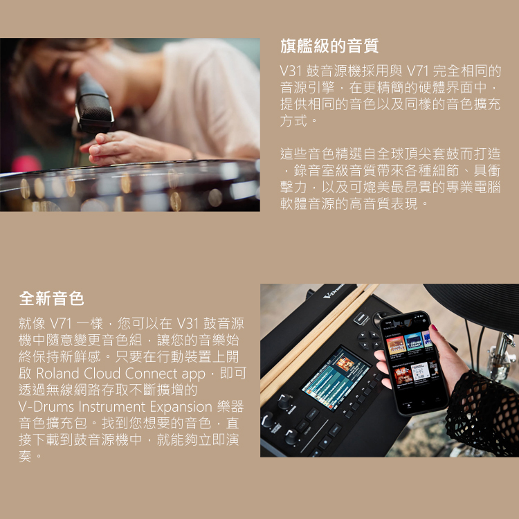 3.使用 Roland Cloud Connect 行動裝置 app,可無線下載V-Drums Instrument Expansion 樂器擴充包和Kit Packs 套鼓擴充包
