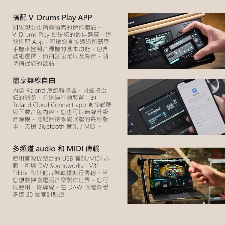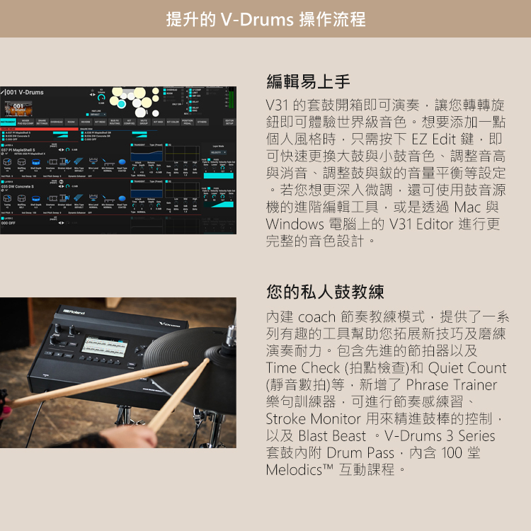 7.搭配 V31 Editor 編輯軟體 (macOS/Windows) 與 V-Drums Play app (iOS/Android)