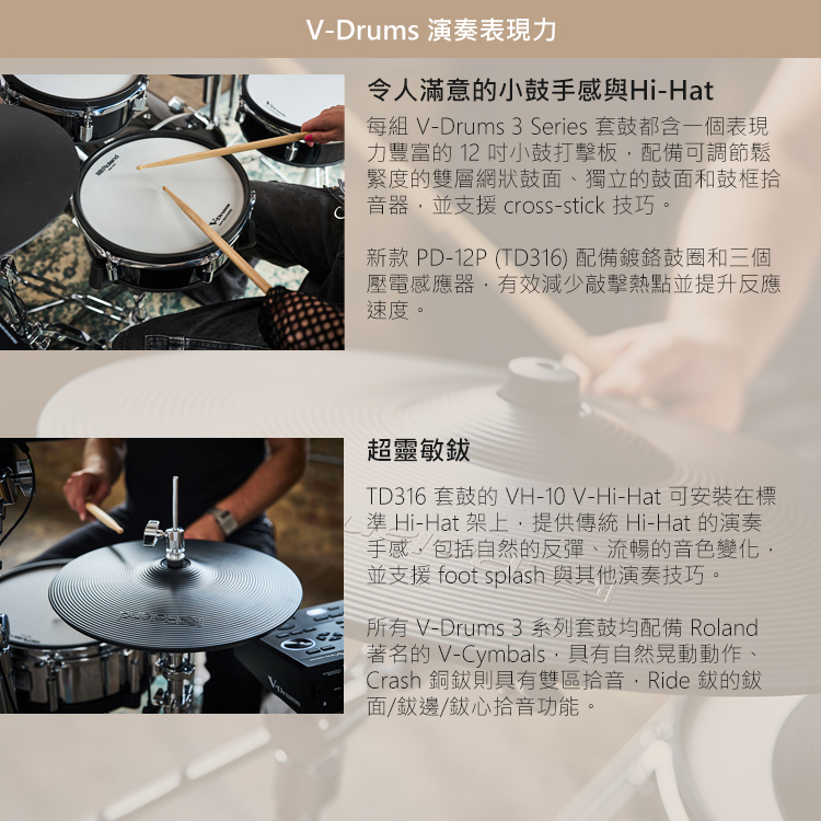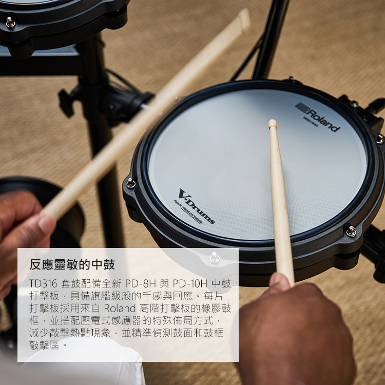 15.重新設計的 PD-8H 和 PD-10H 中鼓打擊板,具有 offset 感應器可展現自然的動態表現並降低熱感應熱點