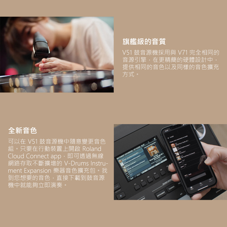 2.使用 Roland Cloud Connect 行動裝置 app,可無線下載 V-Drums Instrument Expansion 樂器擴充包和 Kit Packs 套鼓擴充包