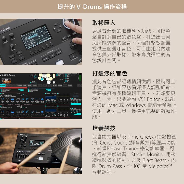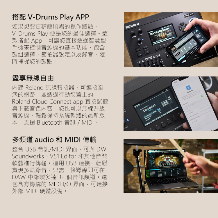 6.搭配專屬 V51 Editor 編輯軟體 (macOS/Windows) 與 V-Drums Play app (iOS/Android)