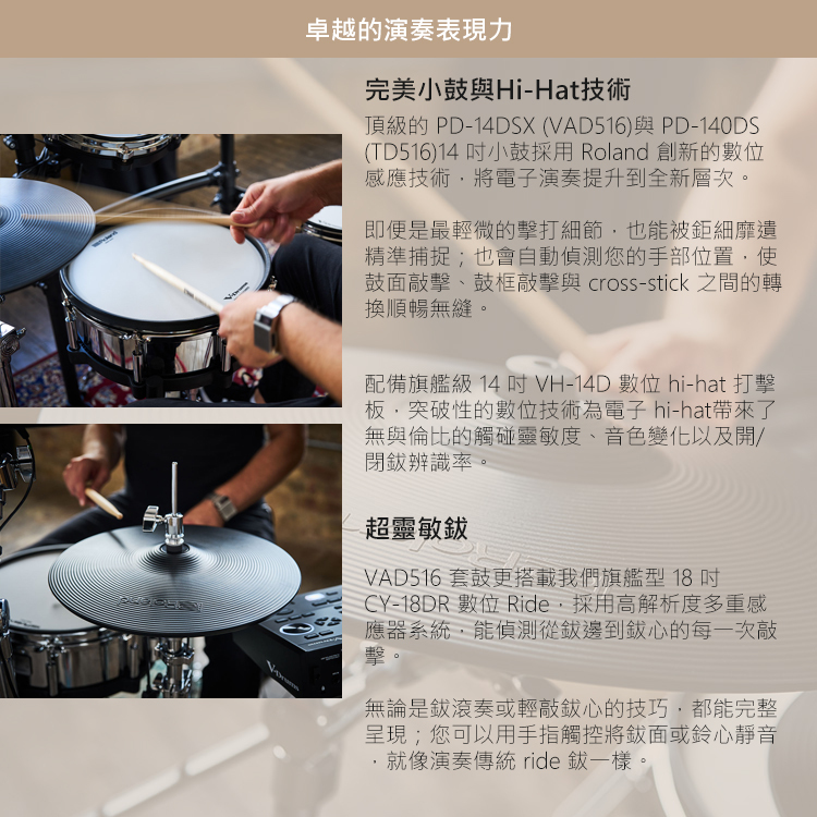 21.CY-14R-T 和 CY-16R-T crash 鈸,具有自然的反應,鈸面/鈸邊拾音器,支援 choke 握鈸悶音