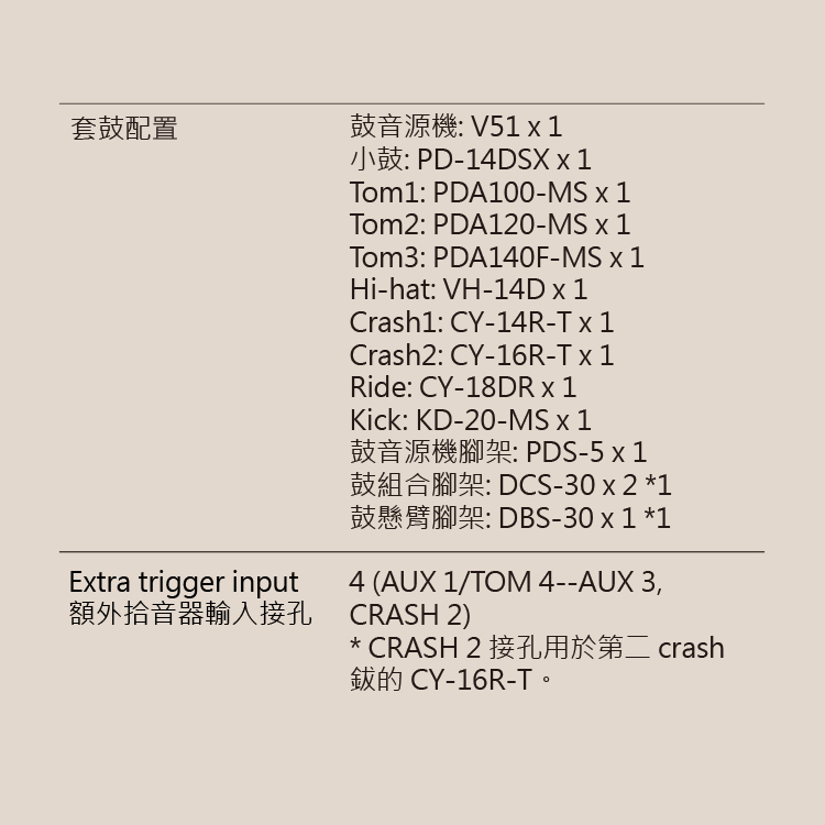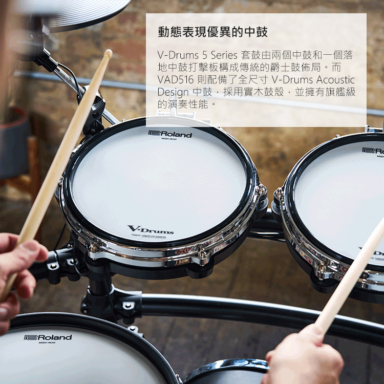 旗艦級 V-Drums 5 系列套鼓,配備可擴充 V51 鼓音源機、進階的數位打擊板和全深度木鼓殼。