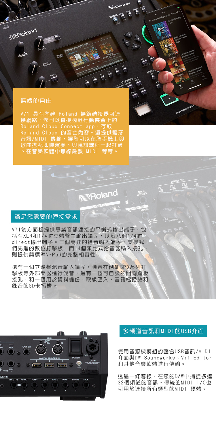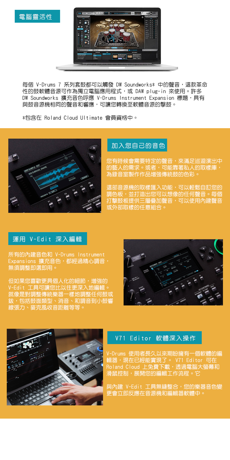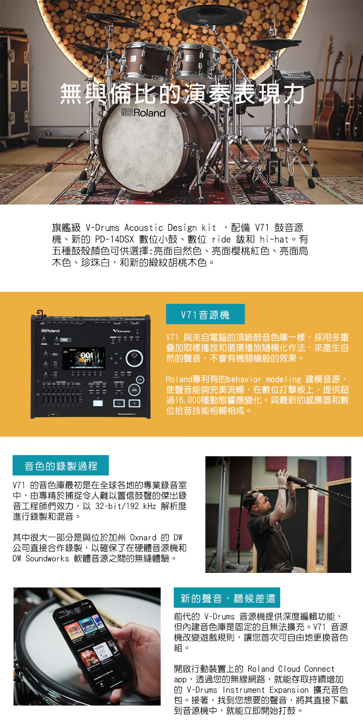 V-Drums 7 系列為 V-Drums 傳奇開啟了充滿動態表現力的新篇章,透過重新設計的音源機、新一代打擊板,以及增強的創意工具,讓世界領先的電子鼓的更上一層。 我們最新的旗艦級平台,為您帶來兩種演奏方式:與 Drum Workshop (DW) 合作創造的核心內建音色庫,和用於電腦演奏鼓的 DW Soundworks 軟體。透過內建無線連接功能,和您智慧型手機上的 Roland Cloud Connect,您可以使用不斷增長的 V-Drums 樂器擴充音色、Kit Packs 套鼓音色包等等,立即改變您的聲音。