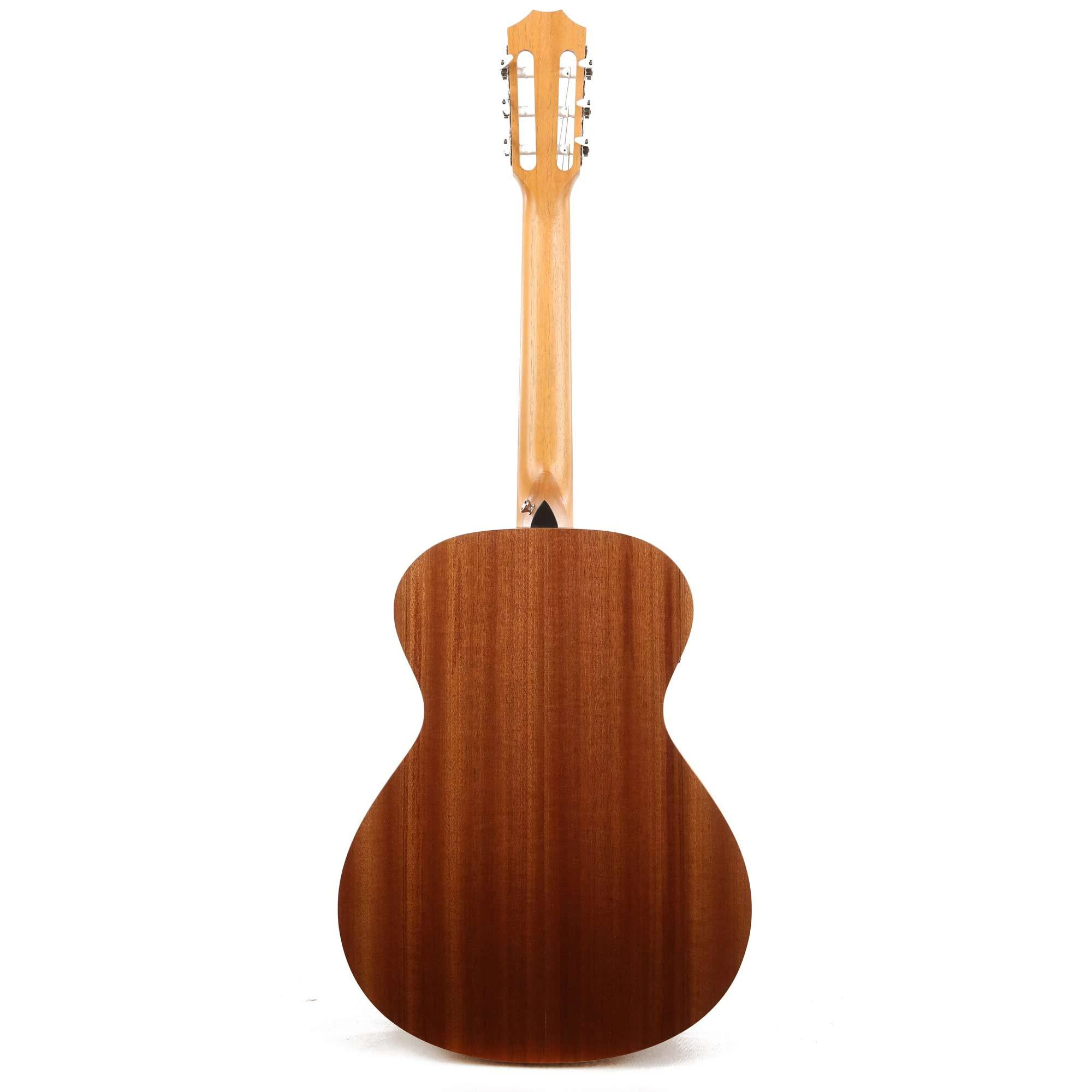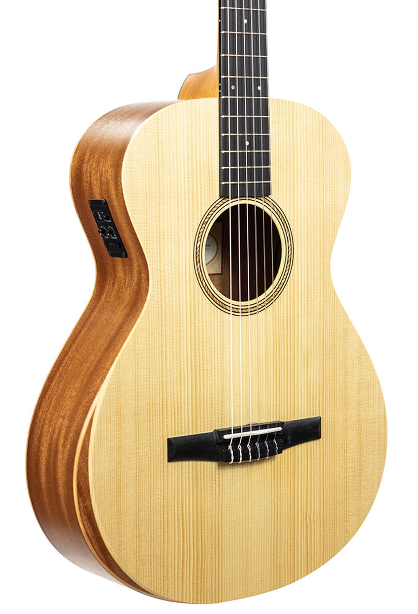 This acoustic/electric nylon-string Grand Concert from our Academy Series may be the best nylon-string guitar you’ll find for the money. The underlying design goal of the series is to make the acoustic guitar accessible to more players by bringing Taylor’s legendary playability and tone into an affordable price range. One of the benefits of a nylon-string guitar is that the light string tension is easy on the fingertips. Another inviting feature is a built-in armrest to enhance the playing comfort. Tonally, the wood pairing of layered sapele back and sides with a solid Lutz spruce top, together with the body’s internal bracing, project a warm, mellow nylon voice with crisp percussive appeal that suits a variety of musical styles and responds well to both fingerpicking and flatpicking. The onboard ES-N pickup and preamp captures that nylon character and give you additional tone-shaping control. Whether you’re a steel-string player looking to add an affordable nylon-string to your acoustic toolbox or crave a great-sounding acoustic guitar that’s easy on the hands and the wallet, the A12e-N is an option well worth exploring.