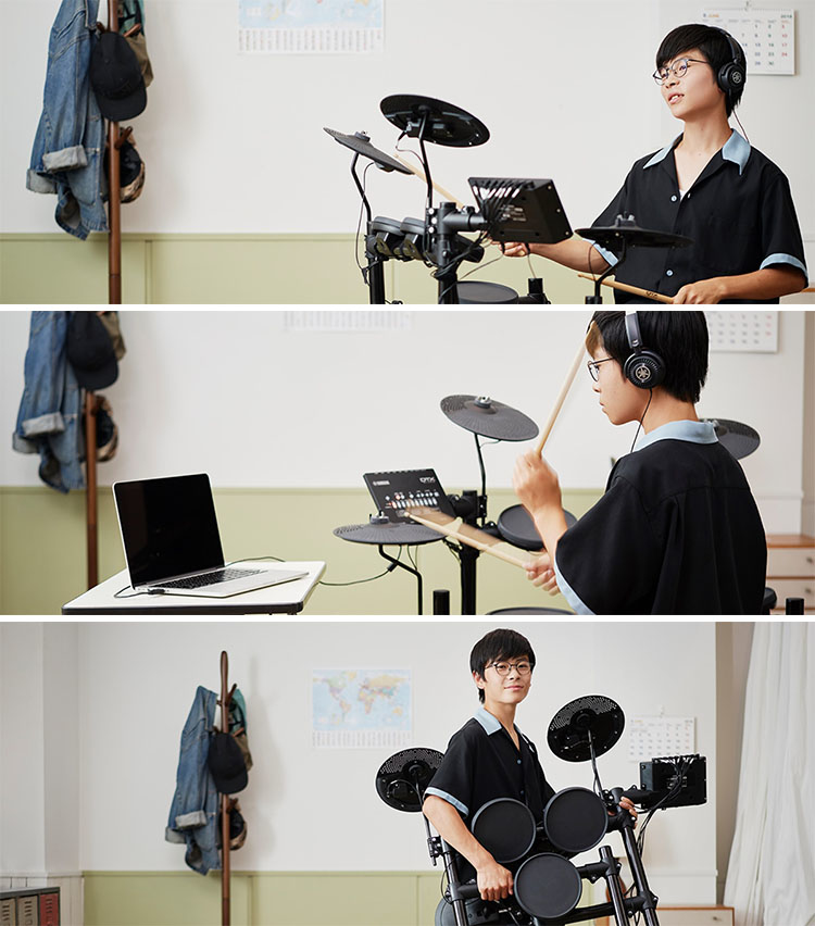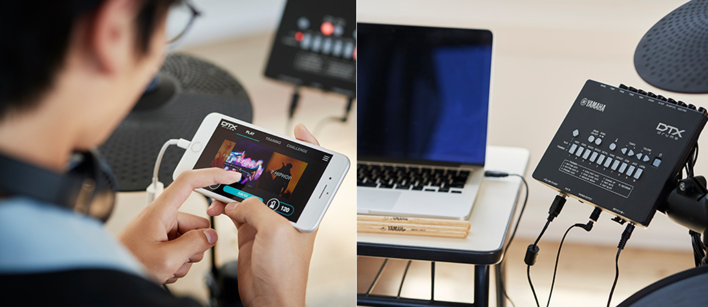 專用的iOS / Android App應用程式DTX402 Touch可讓您以更有趣、更容易理解的方式進行練習。還可以與Rec'n'Share iOS App應用程式配合使用,可以幫助您邊播放自己喜愛的歌曲邊打鼓練習,並可以簡單快速地進行錄影分享。