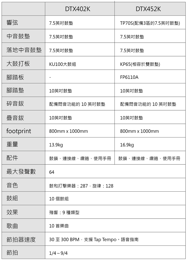 DTX402與DTX452是2018年新品,兩款主機都是同一個,不同的地方在於DTX452採用三區感應小鼓打板與真實大鼓踏板,DTX402則是用新開發的打板組與靜音大鼓感應踏板,兩款的價格也差了近一萬,另外DTX452可支援雙踏,如果想要追求更好的效果可選擇DTX452。