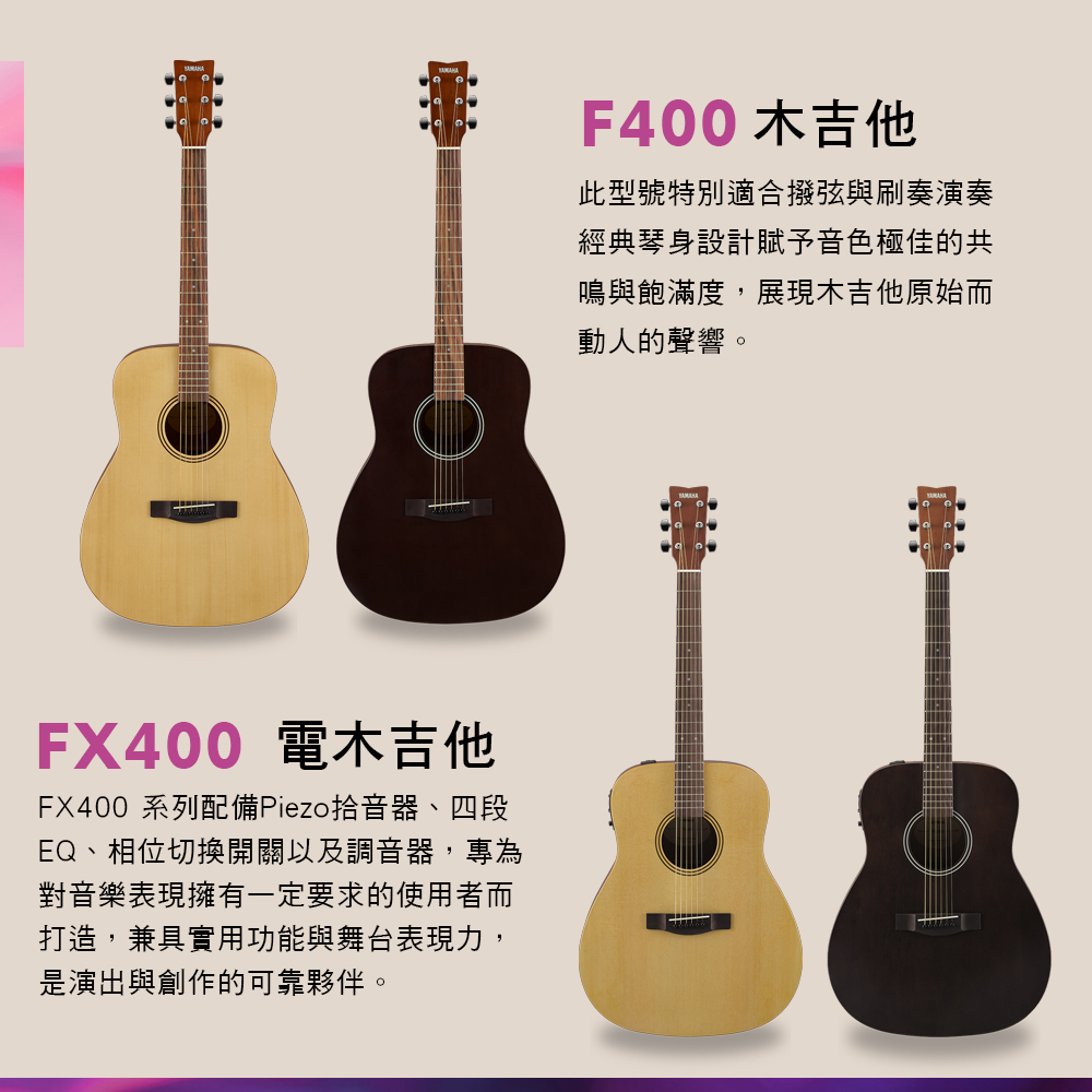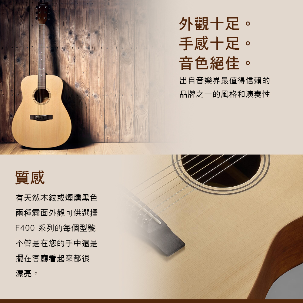 F400 與所有的 Yamaha 木吉他一樣地注重品質與音色,採用傳統西方大桶身的琴體( Traditional Western Body),以呈現豐富飽滿的音色,非常適合指彈和刷彈。