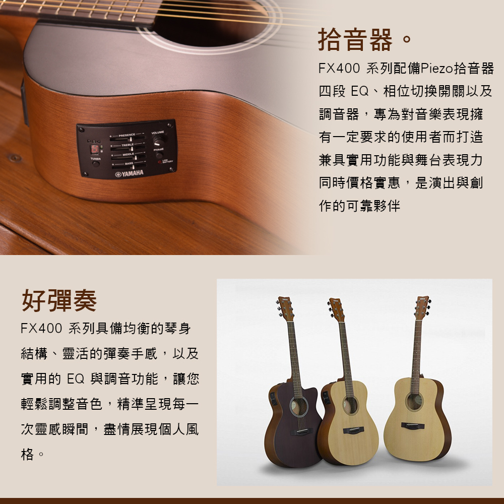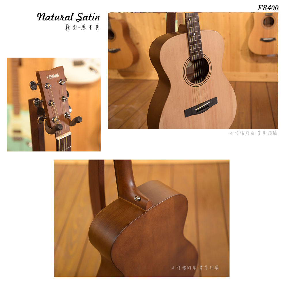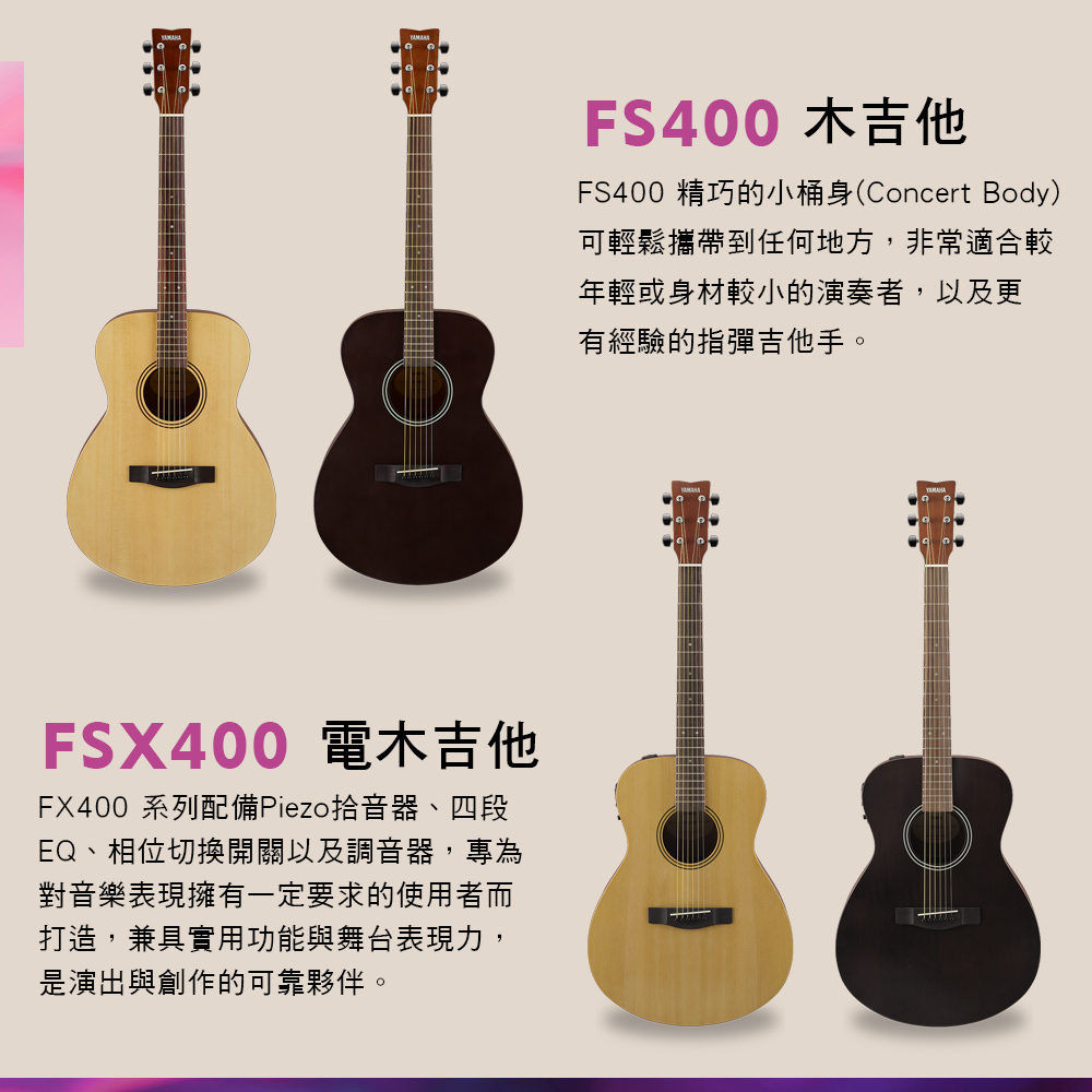 FS400 與所有的 Yamaha 木吉他一樣地注重品質與音色,並且採用符合現代流行的簡潔外觀設計。舒適的S琴體小桶身非常適合較年輕或身材較小的演奏者。