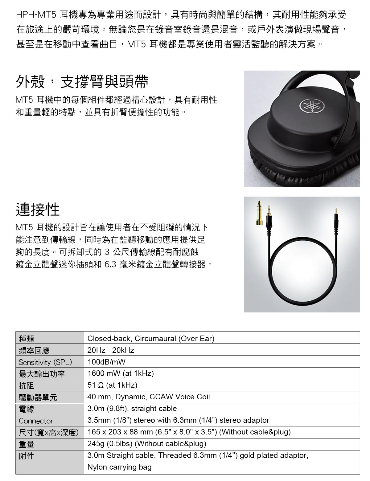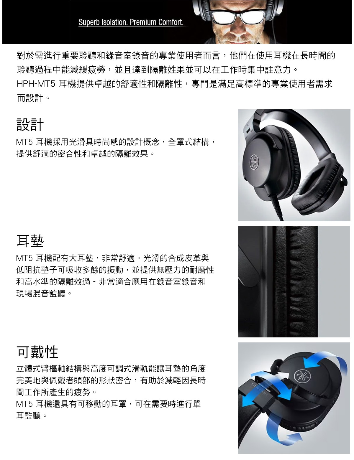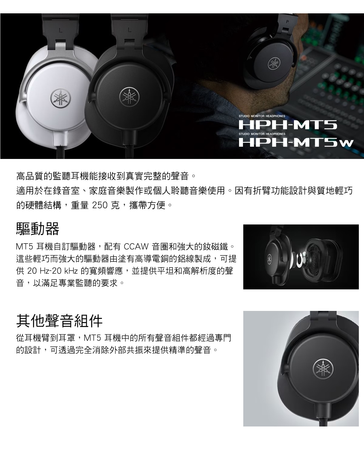 高品質的監聽耳機能接收到真實完整的聲音。適用於在錄音室、家庭音樂製作或個人聆聽音樂使用。因有折臂功能設計與質地輕巧的硬體結構,重量 250 克,攜帶方便。