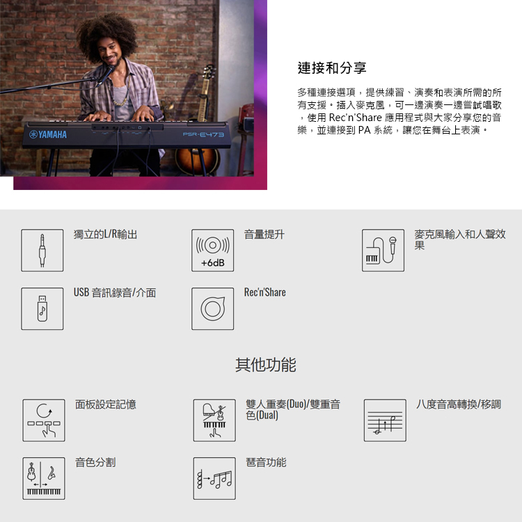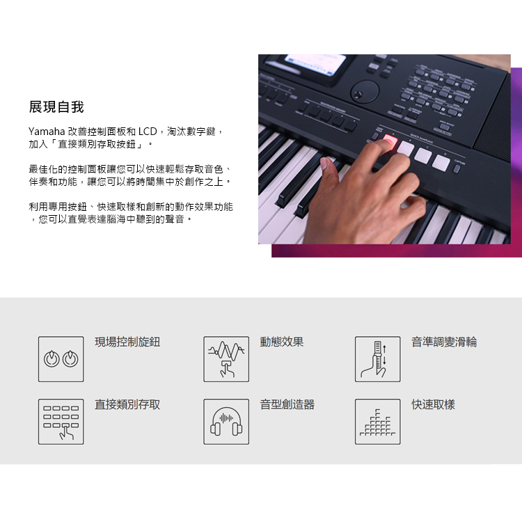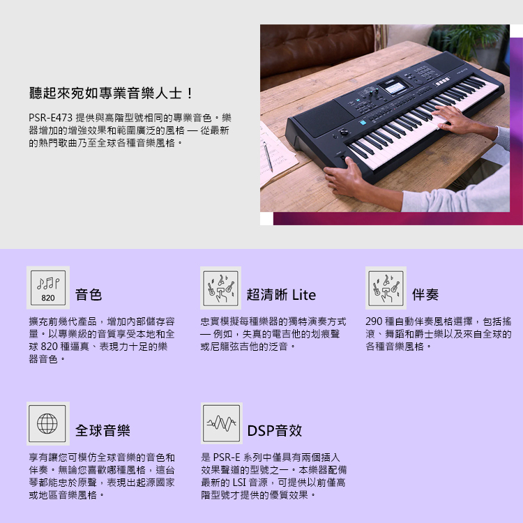 全新手提電子琴PSR-E473靈敏的觸鍵和強大的發聲源技術,融合完美的音色與美妙的觸感。