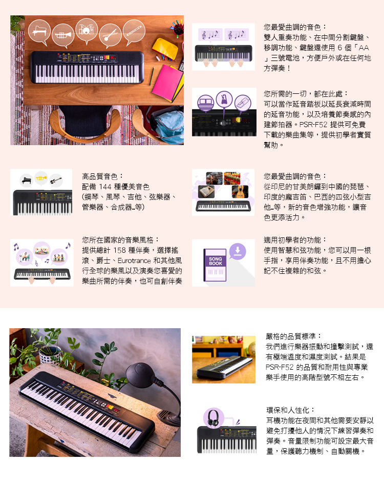 適合初學者使用的電子琴,具有特色的樂器音色和來自許多不同國家的自動伴奏。