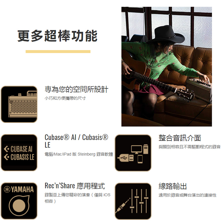 • 類別相容 USB 連線,可輕鬆連接電腦/Mac 以及行動裝置進行錄音和播放音樂