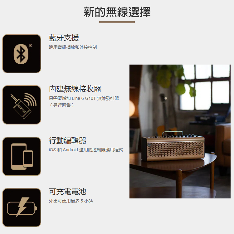 • 支援藍牙連接,可以撥放音訊,也可以用專用App進行音箱的設定與遠端操控