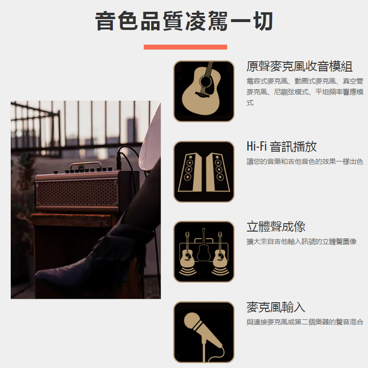 • 3 種擬真的麥克風收音模式、尼龍弦模式和平坦頻率響應(flat)模式