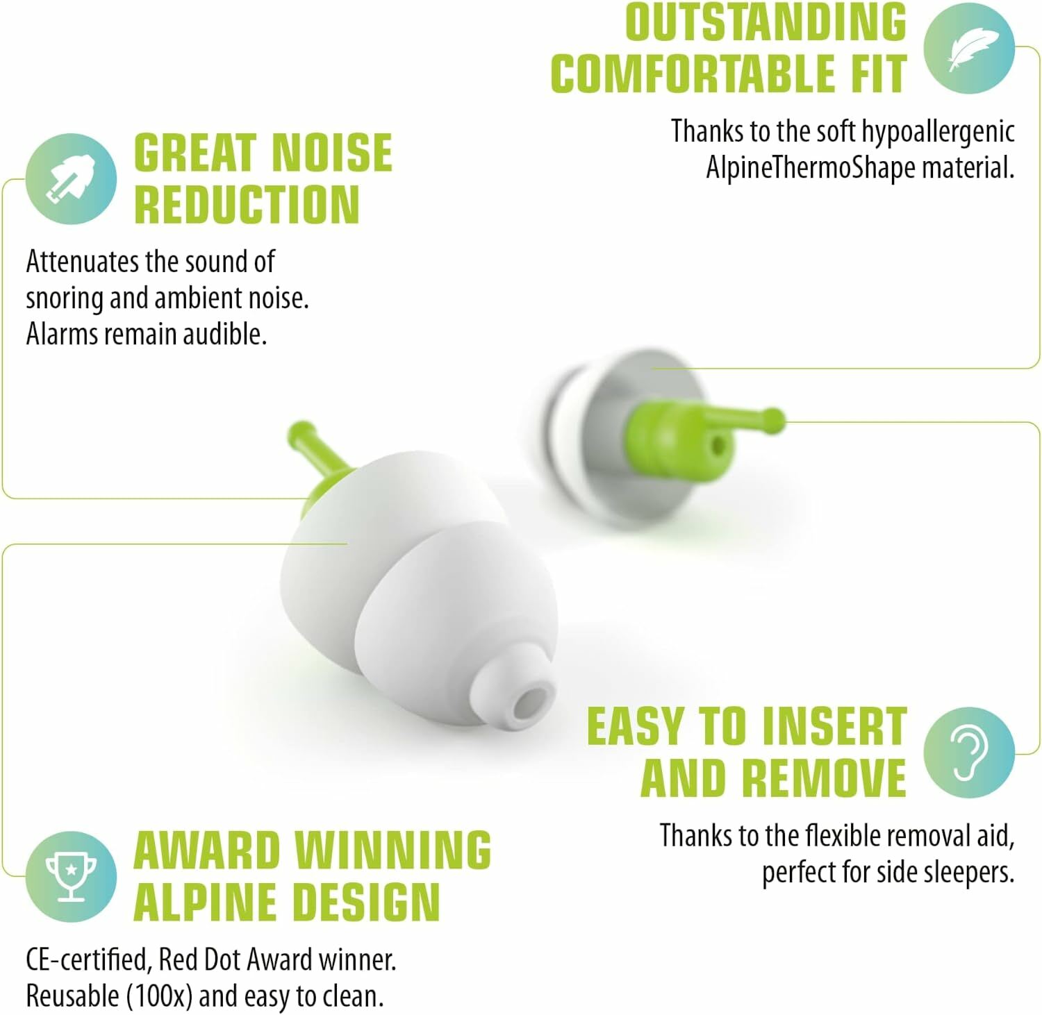 ‧獨特 AlpineAcousticFilter 設計,讓您依舊可聽到門鈴、警鈴和鬧鐘聲