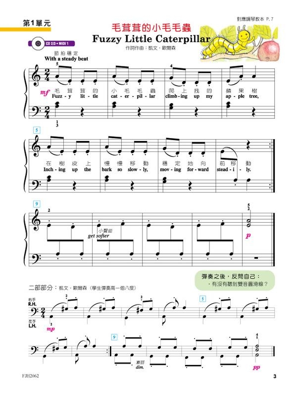 本書中的新技巧有:大調和小調音型與三和弦,兩手之間的平衡,以及踏板的運用。